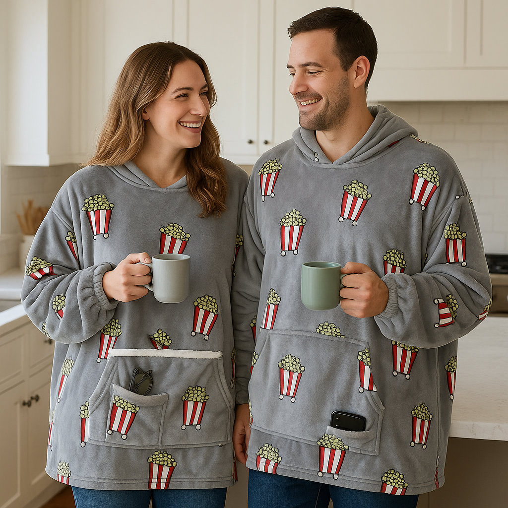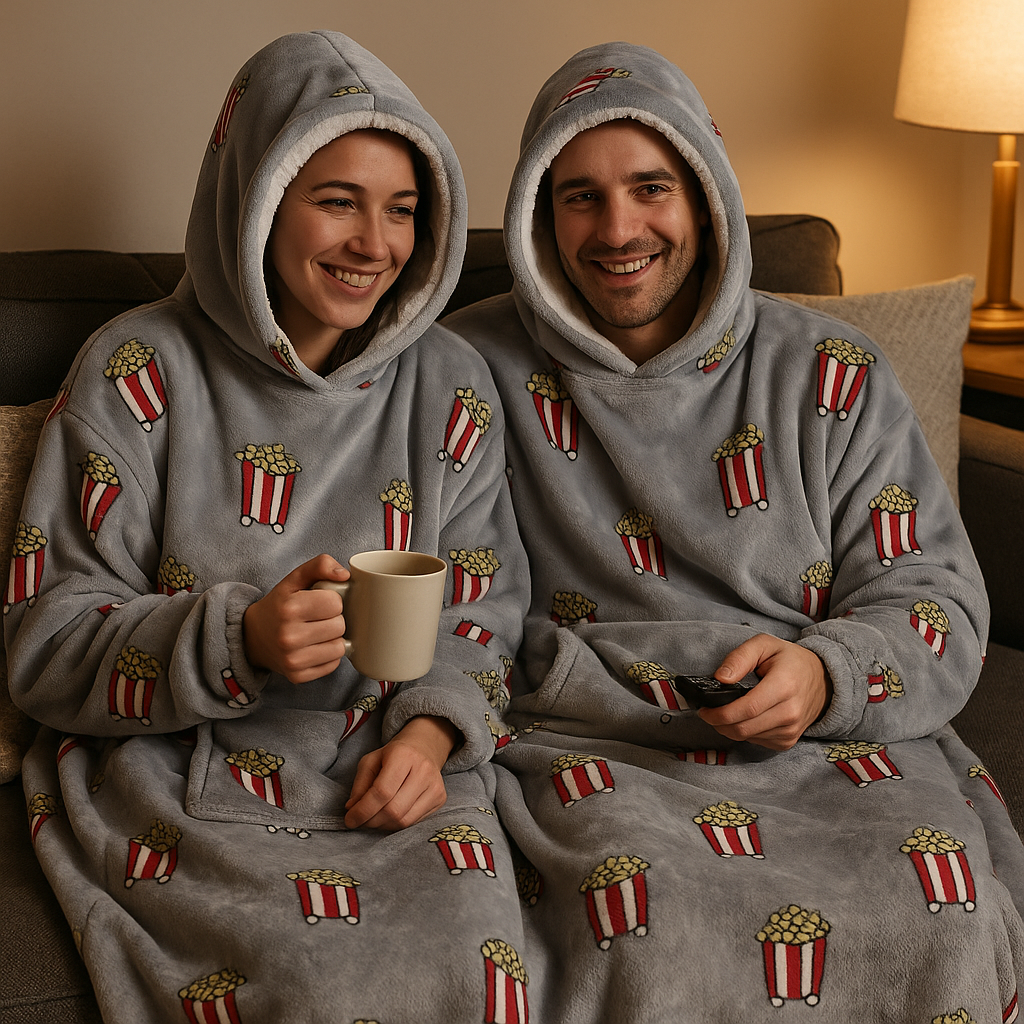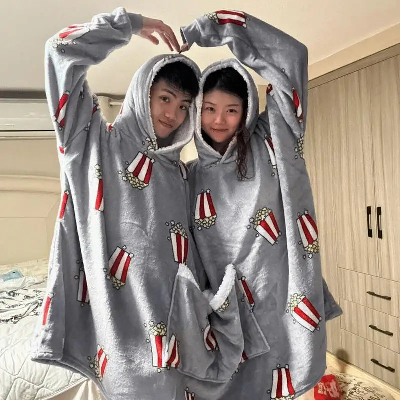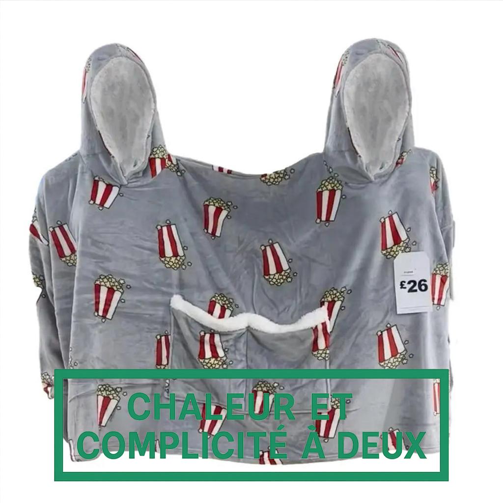 Aussi appelée : couverture‑pull pour couple, poncho couverture double à capuche, couverture géante à capuche pour deux, voire plaid familial à capuche motif popcorn selon les styles.