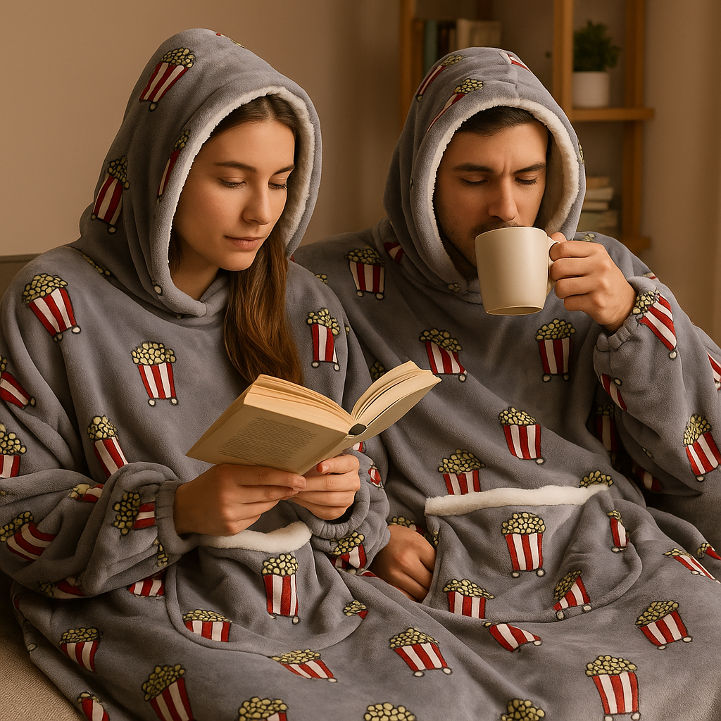 Avec notre couverture à capuche pour deux personnes (vraie hoodie blanket pour deux), tout change : 2 capuches, 2 manches, 2 grandes poches. Son format extra‑large vous enveloppe tous les deux, chacun à l’aise, tout en restant bien proches. Fini les tiraillements, place au confort partagé.
