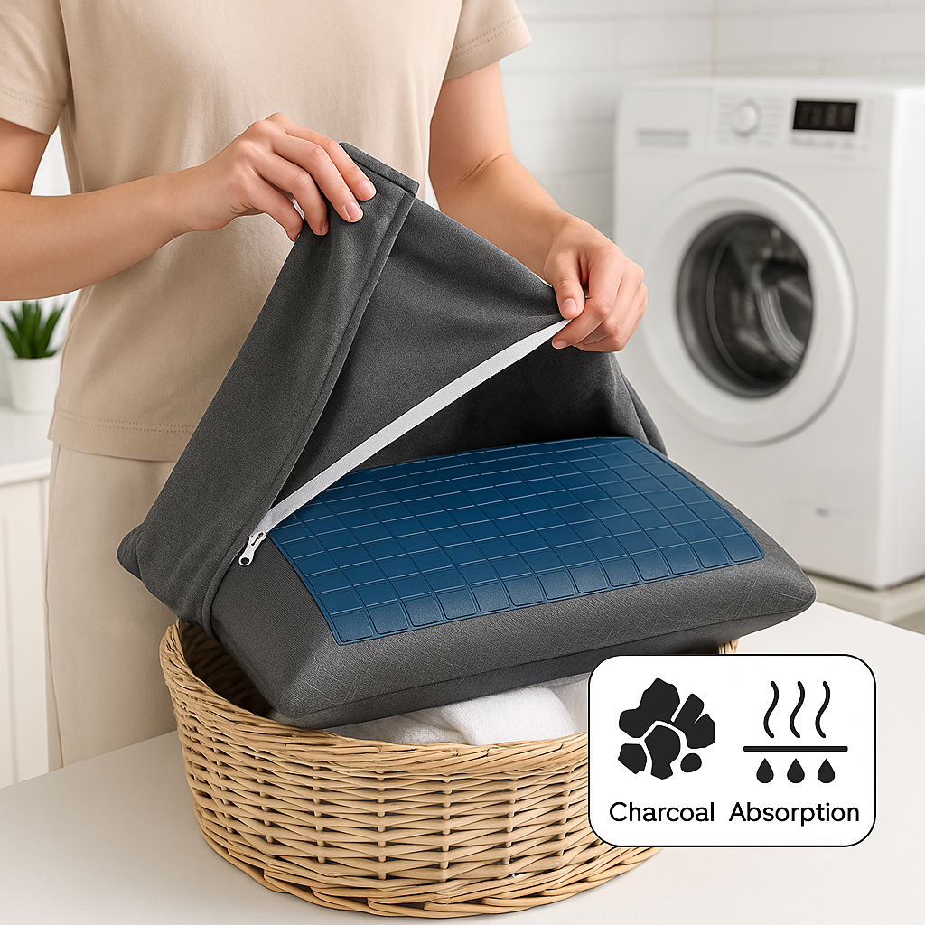 Avec l’oreiller refroidissant à gel, tout change : le charbon de bambou aide à neutraliser les odeurs, la housse douce et respirante est facile à entretenir, et la conception double-face vous suit toute l’année — côté gel pour un oreiller été rafraîchissant, côté mousse pour un moelleux enveloppant.